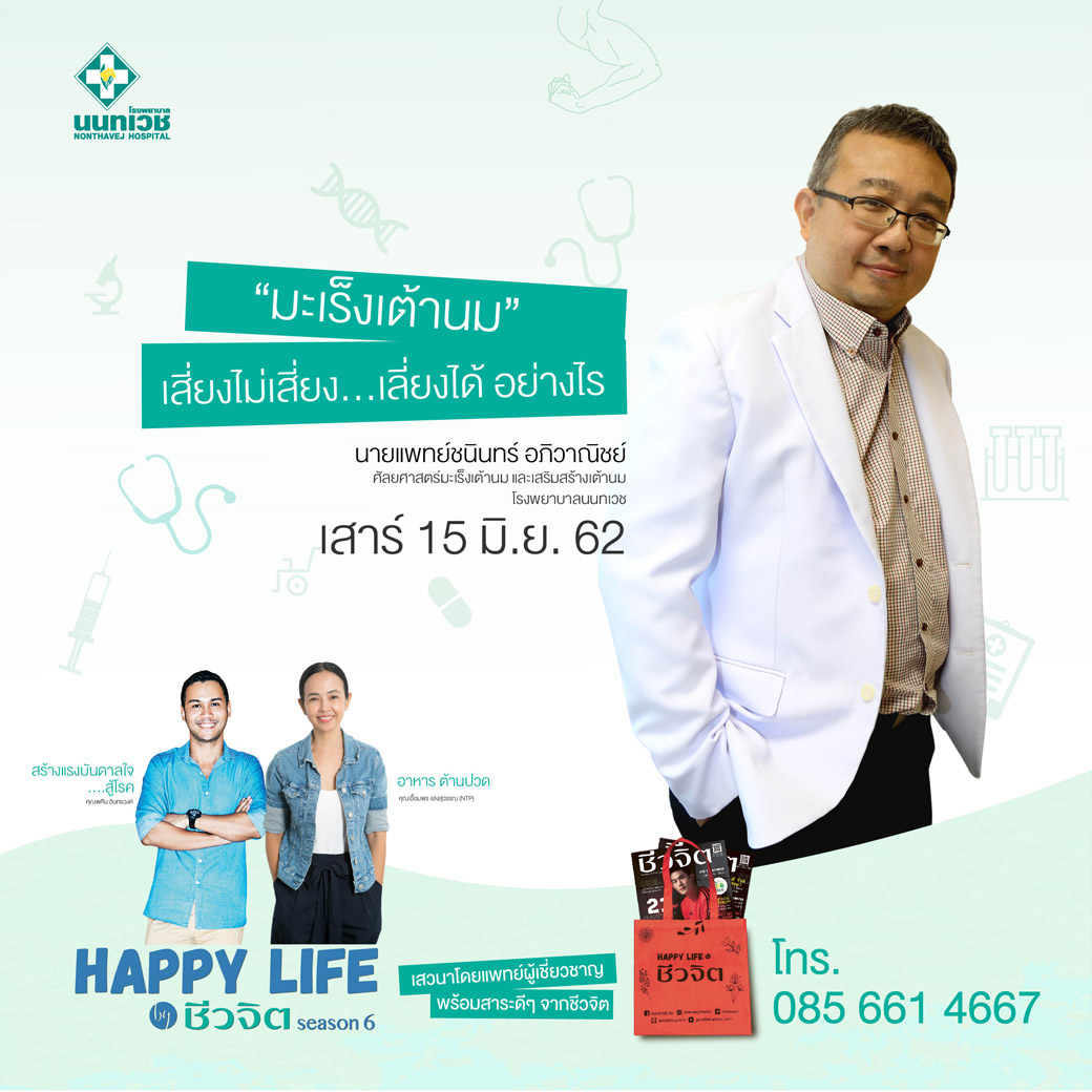 - ช่วงที่ 3 นายแพทย์ชนินทร์ อภิวาณิชย์ แพทย์ผู้เชี่ยวชาญ ศัลยศาสตร์มะเร็งเต้านม และเสริมสร้างเต้านม โรงพยาบาลนนทเวช กับประเด็นการเสวนาเรื่อง “มะเร็งเต้านม” เสี่ยงไม่เสี่ยง…เลี่ยงได้ อย่างไร