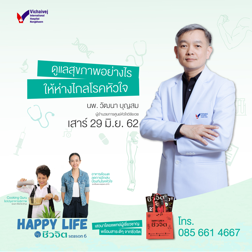 - ช่วงที่ 3 นพ.วัฒนา บุญสม ผู้อำนวยการศูนย์หัวใจวิชัยเวช มีความเชี่ยวชาญพิเศษ ในการสวนหัวใจและขยายหลอดเลือด ร่วมเสวนากับหัวข้อ “ดูแลสุขภาพอย่างไร ให้ห่างไกลโรคหัวใจ”