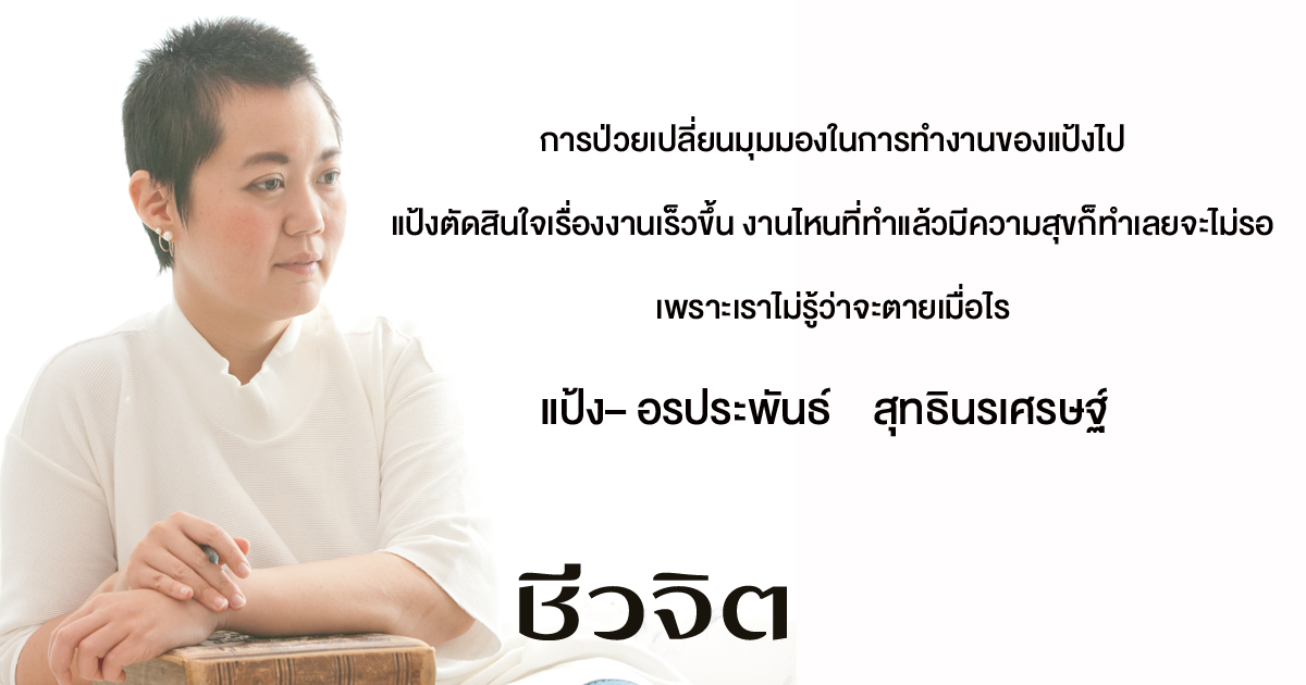 “การป่วยเปลี่ยนมุมมองในการทำงานของแป้งไป 2 ด้านค่ะ ด้านแรกคือ แป้งตัดสินใจเรื่องงานเร็วขึ้น งานไหนที่ทำแล้วมีความสุขก็ทำเลยจะไม่รอ เพราะเราไม่รู้ว่าจะตายเมื่อไร อยากทำอะไรก็รีบทำดีกว่า
