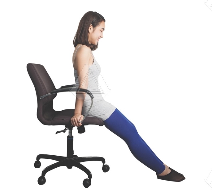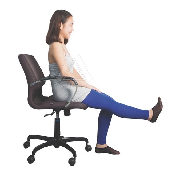 •นั่งบนเก้าอี้ หลังพิงพนักเก้าอี้ไว้ ถ้าเท้ายังอยู่ที่พื้นได้ในท่านี้ ให้ใช้ผ้าเช็ดตัวรองไว้ใต้ขาเพื่อให้เท้าลอยเหนือพื้น