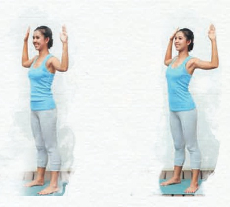ยืนกางขาเท่ากับช่วงไหล่ ยกแขนขึ้น ประสานมือไว้ด้านหลังศีรษะ สูดหายใจเข้าทางจมูกลึกๆ เพื่อขยายทรวงอก