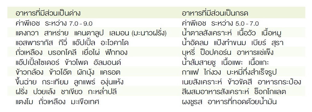 “ถ้าจะกิน ควรกินอาหารที่ค่าพีเอชใกล้เคียงกับกลาง (พีเอช 7) ให้มากที่สุด เช่น ข้าวกล้อง (พีเอช 6.5 - 7.5) ปลาดุกหรือปลาช่อน (พีเอช 6.6 - 7) กุ้ง (พีเอช 6.8 - 8.2) ถั่วลันเตา (พีเอช 5.3-6.8) จะสังเกตได้ว่าอาหารทะเลนั้นมีส่วนที่จะเป็นด่างมาก ชีวจิต ถึงแนะนำให้กินได้ โดยดูตัวอย่างอาหารกรด - ด่างอื่นๆ ได้ที่ตารางต่อไปนี้