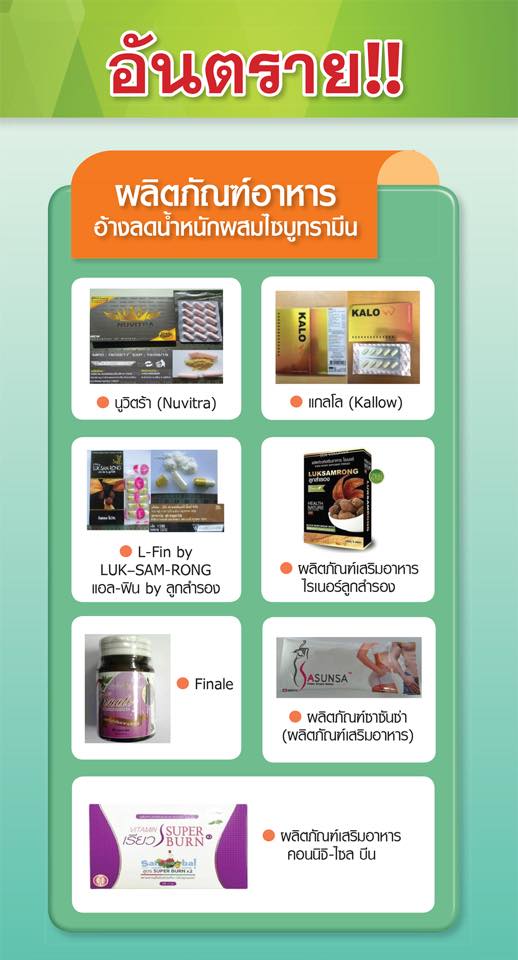 1. ผลิตภัณฑ์อาหารอ้างลดน้ำหนักผสมไซบูทรามีน