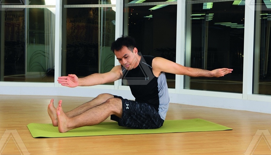 -นั่งหลังตรง ยืดขาไปด้านหน้า งอเข่าเล็กน้อยพอให้รู้สึกสบาย กดสะโพกสองข้างให้ติดพื้น กางแขนออกให้สุด ผ่อนคลายหัวไหล่ ดึงศอกออกด้านข้าง ขนานกับพื้น