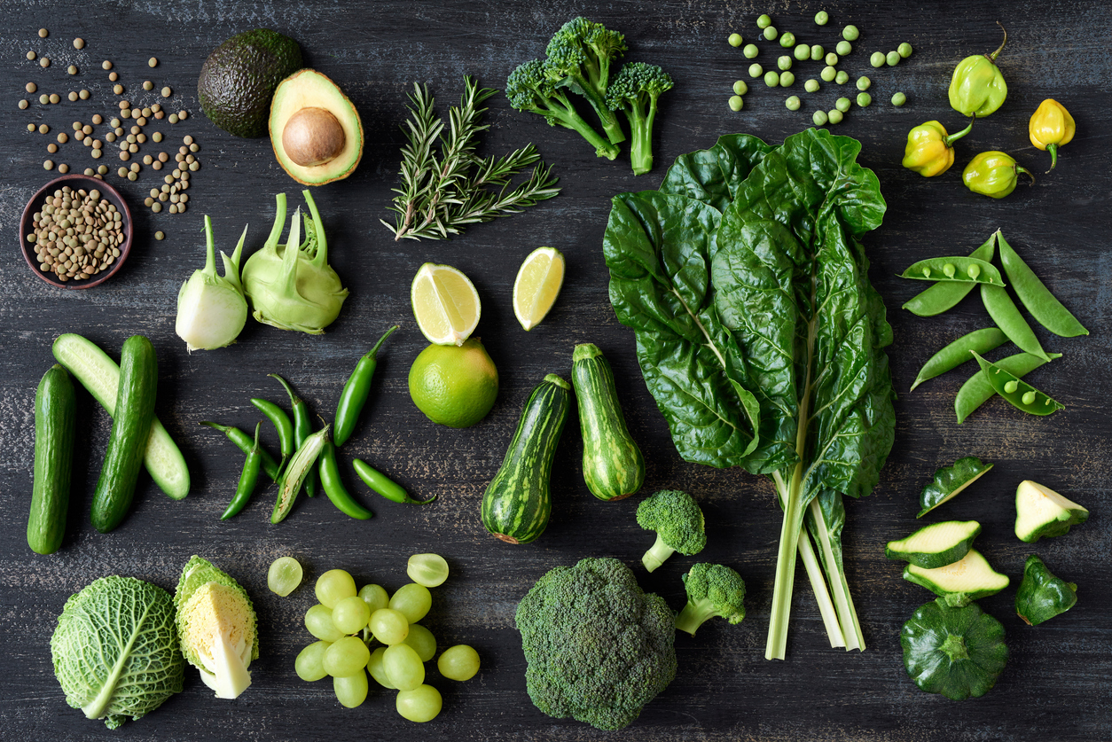 ผักผลไม้ในกลุ่มสีเขียว เช่น ผักใบเขียวชนิดต่างๆ บล็อกโคลี หน่อไม้ฝรั่ง ผักโขม กีวี่ อะโวคาโด องุ่นเขียว