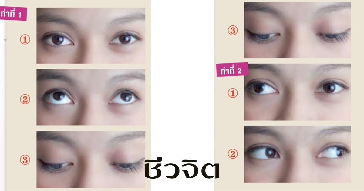 หลับตาครู่หนึ่ง หายใจเข้าและออก นับเป็น 1 ครั้ง ทำทั้งหมด 5 ครั้ง จากนั้นกลอกตาไปทางซ้ายและขวา นับเป็น 1 ครั้ง ทำทั้งหมด 5 ครั้ง