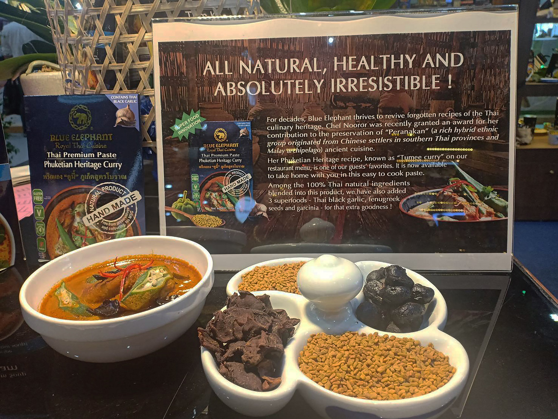 ในงาน THAIFEX 2019 – World of Food Asia หรืองานแสดงสินค้าอาหารและเครื่องดื่มระดับเอเชีย ในครั้งนี้จะนำเสนอภายใต้แนวคิด “Thai Curry Specialist” หรือผู้เชี่ยวชาญด้านแกงไทย โดยในปีนี้ เชฟนูรอ จะชูไฮไลท์ในเรื่องวัตถุดิบชั้นเลิศ (Superfoods) ด้วยการเปิดตัวพริกแกงสำเร็จรูปที่มีส่วนผสมของวัตถุดิบที่อุดมไปด้วยคุณค่าทางอาหาร ได้แก่ เครื่องแกงตูมี้ แกงภูเก็ตสูตรโบราณ ที่มีส่วนผสมของกระเทียมไทยดำ (Thai Black garlic), ส้มแขก (garcinia) และลูกซัด (fenugreek) ซึ่งเป็นเมนูที่ได้รับความนิยมจากลูกค้าร้านอาหารบลู เอเลเฟ่นท์