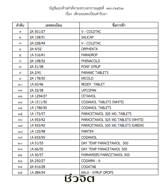 อาศัยอํานาจตามความในมาตรา 86 แห่งพระราชบัญญัติยา พ.ศ. 2510 ซึ่งแก้ไขเพิ่มเติม โดยพระราชบัญญัติยา (ฉบับที่ 5) พ.ศ. 2530 รัฐมนตรีว่าการกระทรวงสาธารณสุขโดยคําแนะนํา ของคณะกรรมการยาในการประชุมครั้งที่ 389-3/2562 เมื่อวันที่ 23 พฤษภาคม 2562 จึงมีคําสั่งเพิกถอนทะเบียนตํารับยาที่มีพาราเซตามอลเป็นส่วนประกอบ ชนิดรับประทาน จํานวน 25 ตํารับ มีดังต่อไปนี้