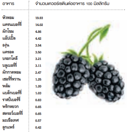 จากตารางจะเห็นได้ว่า ผักที่มีเควอร์เซตินมากที่สุดคือ หัวหอม รองลงมาคือ ผักโขม แครอต และบรอกโคลี ส่วนผลไม้ที่มีเควอร์เซติน ได้แก่ แอ๊ปเปิ้ล เบอร์รี่ โดยเฉพาะแครนเบอร์รี่ ซึ่งนับได้ว่ามีมากเป็นอันดับหนึ่งของทางฝั่งผลไม้เลยทีเดียว