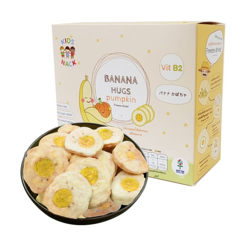 กล้วยสอดไส้ฟักทองฟรีซดราย ผลิตจากกล้วยแท้ๆ ไม่ผสมแป้ง,น้ำตาลและน้ำมัน คงคุณค่าสารอาหารด้วยกระบวนการฟรีซดรายไม่ผ่านความร้อน จึงคงความสดใหม่ กรอบ หอม อร่อย พร้อมคุณประโยชน์จากฟักทอง,กล้วย