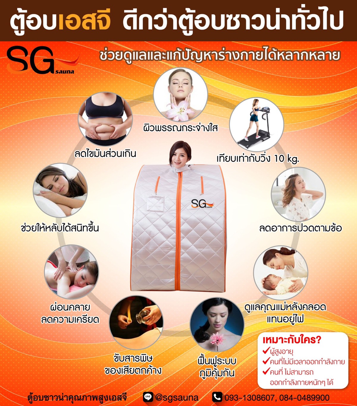 ดูแลตัวเองสวยยกเซ็ตในเครื่องเดียว! ตอบโจทย์ได้ทั้งเรื่องการดูแลผิวพรรณและควบคุมรูปร่าง เพราะตู้อบซาวน่า SG สามารถแสดงประสิทธิภาพการทำงานดีกว่าซาวน่าระบบอื่น 2-3 เท่า ให้ความร้อน เช่นเดียวกับแสงอาทิตย์ที่ส่งความร้อนผ่านลงลึกได้ถึงขั้นไขมันและกล้ามเนื้อทำให้เหงื่อออกมาก น้ำหนักลดลงฟื้นฟูผิวเปล่งปลั่ง ช่วยให้หลับง่าย และลดปัญหาสุขภาพได้ดีขึ้นเหมาะสมอย่างยิ่งสำหรับผู้ที่ไม่มีเวลาออกกำลังกายและต้องการความงาม ดูแลสุขภาพแบบครบทุกด้าน