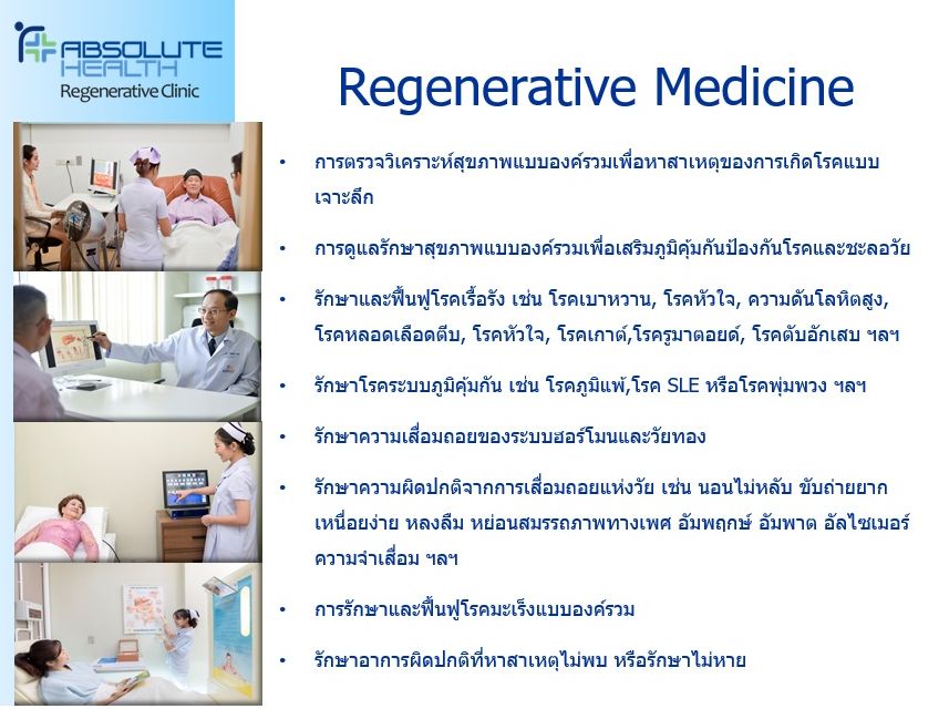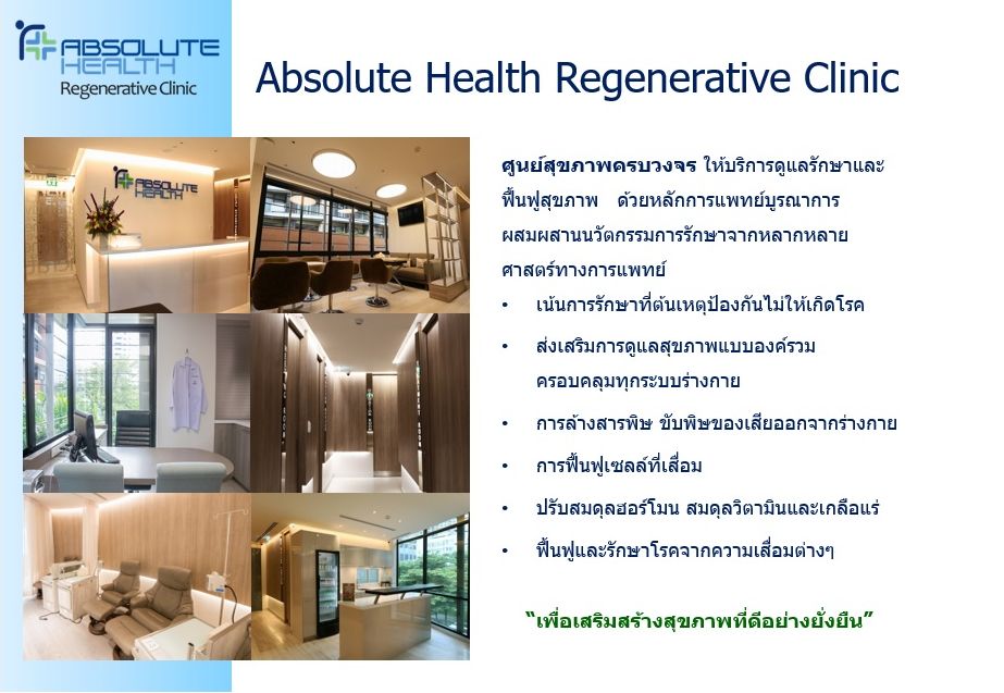 ศูนย์การแพทย์ แบบบูรณาการ Absolute Health Regenerative Medicine รักษา ฟื้นฟู และแก้ไขโรคที่ต้นเหตุ การแพทย์เพื่อสุขภาพที่แท้จริง ศูนย์การแพทย์แบบบูรณาการ ที่ผสมผสนาการรักษาและการบริการที่ครบครัน พรั่งพร้อมด้วยทีมแทพย์ และบุคลากรทางการแพทย์ที่มีความรู้ ความสามารถและมากด้วยประสบการณ์การรักษาแขนงต่างๆ ที่ได้รับการคัดสรรจากทั่งทุกมุมโลก เพื่อให้ทุกๆ การรักษาของคุณ คือสิ่งที่ดีที่สุด เหมาะสมที่สุด