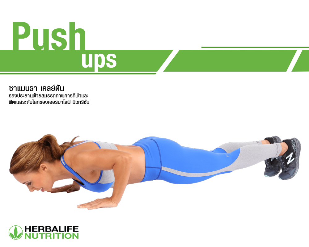 • ยกลำตัวจากหัวถึงส้นเท้าให้ขนานเป็นเส้นตรง เกร็งท้องเพื่อให้สะโพกตั้งตรง จากนั้นงอข้อศอกให้หน้าอกเกือบแตะพื้น และดันตัวขึ้นมาใหม่ นับเป็น 1 ครั้ง จากนั้นทำซ้ำแบบเดิม