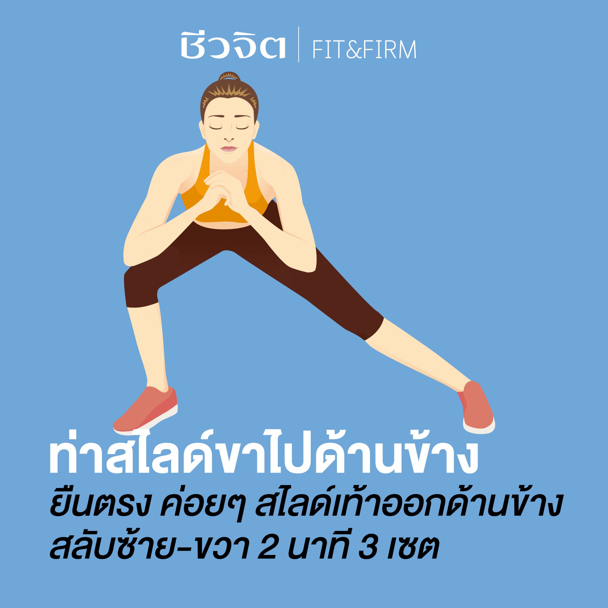วิธีทำ : ยืนตรง ค่อยๆ สไลด์เท้าออกด้านข้าง สลับซ้าย-ขวา 2 นาที นับเป็น 1 เซต ทำ 3 เซต