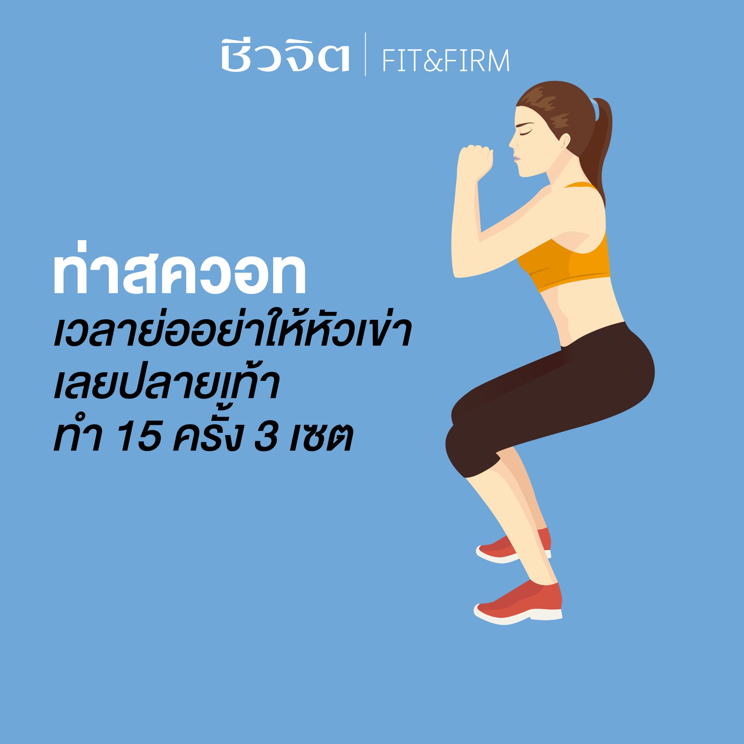 วิธีทำ : เวลาย่อ อย่าให้หัวเข่าเลยปลายเท้า ทำ 15 ครั้ง นับเป็น 1 เซต ทำ 3 เซต