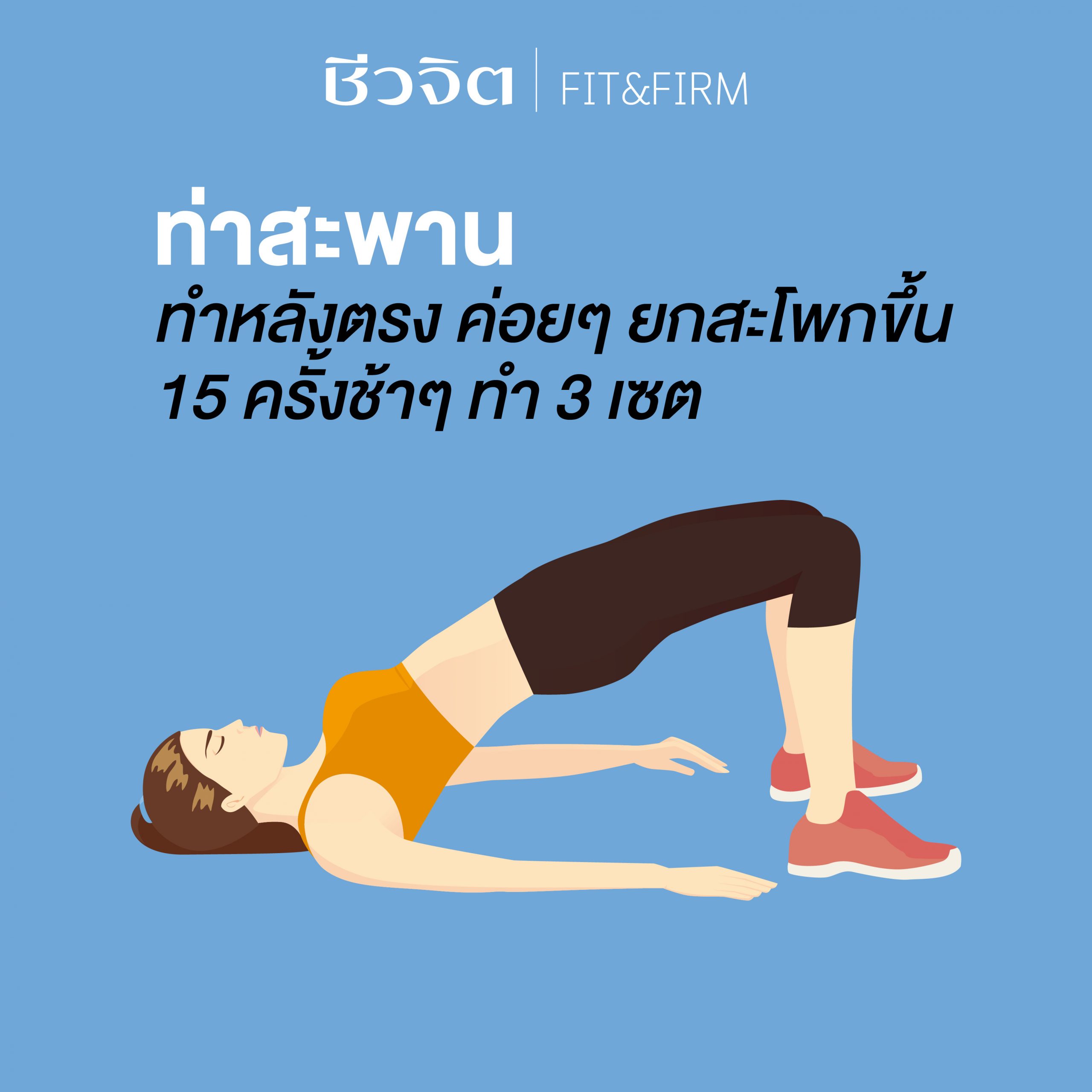 วิธีทำ : นอนลง ชันเข่าขึ้น หลังตรง ค่อยๆ ยกสะโพกขึ้น 15 ครั้ง ช้าๆ นับเป็น 1 เซต ทำ 3 เซต