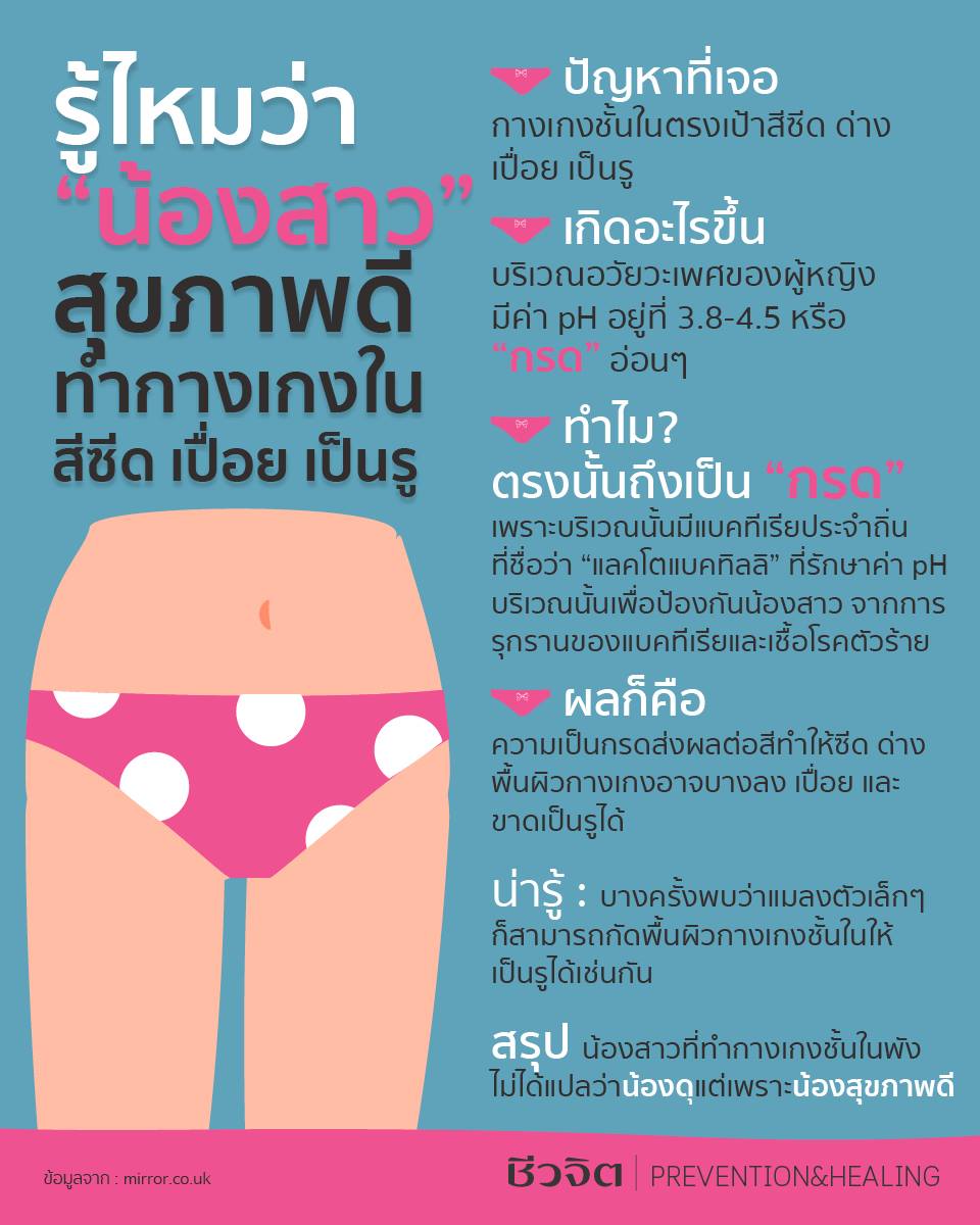 รู้อย่างนี้ก็หายสงสัยกันเสียที ว่าทำไมกางเกงใน ชอบสีซีด เปื่อย เป็นรูง่าย ไม่ต้องกังวลไปค่ะ แปลว่าน้องสาวสุขภาพดี สามารถจัดการเชื้อโรคและแบคทีเรียไม่ดีที่รุกรานน้องสาวได้อยู่