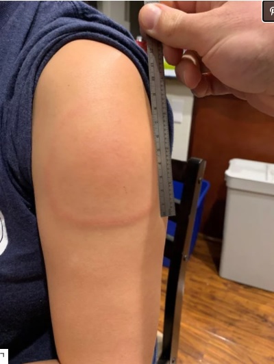 เรื่องนี้เกิดขึ้นในเคสที่รับวัคซีนของ Moderna โดยผู้ที่รับวัคซีนในเข็มแรก บางรายมีอาการคัน เกิดรอยผื่นแดง นูน รอบๆ บริเวณที่ฉีดวัคซีน จากประสบการณ์ของผู้รับวัคซีนที่มีอาการดังกล่าวเล่าว่า หลังฉีดวัคซีนเข็มแรก ประมาณ 7 วันหลังจากนั้น เธอคิดว่าคงไม่มีผลข้างเคียงอะไรแล้ว จนวันนั้นขณะที่เธอเข้านอน เธอเกิดอาการคันรอบๆ บริเวณที่ฉีดวัคซีน แต่ตอนนั้นไม่ได้คิดอะไร จึงนอนหลับต่อ และเมื่อตื่นขึ้นมาก็พบว่า เธอมีอาการคันที่ต้นแขนขวาอย่างมาก เกิดเป็นรอยวงแดงๆ รอบๆ จุดที่ฉีดวัคซีน ซึ่งมีเส้นผ่าศูนย์กลางประมาณ 4 นิ้ว