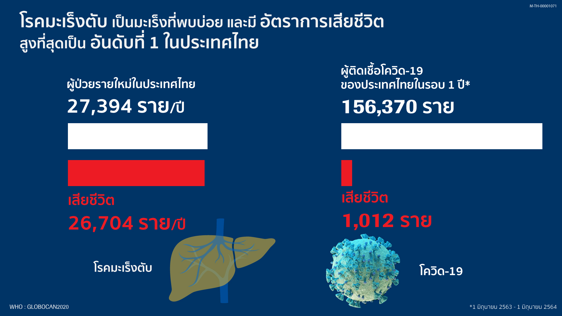 จากความร้ายแรงของวิกฤตสุขภาพทั้งสองโรค เมื่อนำมาเปรียบเทียบกันจะพบว่า ตลอดหนึ่งปีที่ผ่านมา (1 มิถุนายน 2563 1 มิถุนายน 2564) ตัวเลขผู้ติดเชื้อใหม่จากไวรัสโควิด-19 อยู่ที่ 156,370 ราย และมีตัวเลขผู้เสียชีวิตที่ 1,012 ราย ในขณะที่ปี 2563 เพียงปีเดียว พบว่าตัวเลขผู้ป่วยมะเร็งตับรายใหม่อยู่ที่ 27,394 ราย แต่ทว่าตัวเลขผู้เสียชีวิตจากมะเร็งตับกลับอยู่ที่ 26,704 คน หรือคิดเป็น 73 คนต่อวัน โดยเฉลี่ย ซึ่งนับได้ว่าสูงกว่าโควิด-19 ถึง 26 เท่าตัว ทั้งนี้ กลุ่มเสี่ยงของโรคมะเร็งตับได้แก่ ผู้ที่ดื่มสุรา (30%) ผู้ที่มีภาวะไขมันเกาะตับจากการบริโภคอาหารไขมันสูงและผู้ที่เป็นโรคอ้วน (30%) ผู้ที่สูบบุหรี่หรือได้รับสารแอลฟาท็อกซินที่ปนเปื้อนเชื้อรา (30%) ผู้ติดเชื้อไวรัสตับอักเสบบีและซี และผู้ที่มีภูมิลำเนาอยู่ในภาคตะวันออกเฉียงเหนือ (10%) เป็นต้น สถิติพบว่าผู้ป่วยและผู้เสียชีวิตจากมะเร็งตับส่วนใหญ่เป็นเพศชาย อายุเฉลี่ย 40 ปีขึ้นไป ซึ่งช่วงวัยนี้ถือเป็นกำลังสำคัญในการขับเคลื่อนประเทศ โดยเฉพาะอย่างยิ่งเมื่อประเทศไทยกำลังเข้าสู่สังคมผู้สูงอายุอย่างสมบูรณ์ ดังนั้นจึงกล่าวได้ว่า โรคมะเร็งตับคร่าชีวิตผู้คนมากกว่าและสร้างความเสียหายให้แก่ประเทศไทยไม่ยิ่งหย่อนไปกว่าไวรัสโควิด-19 แม้แต่น้อย