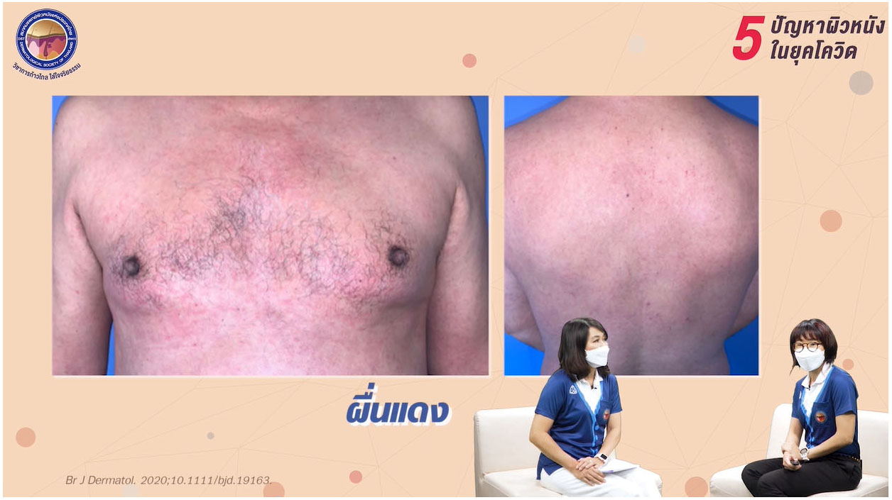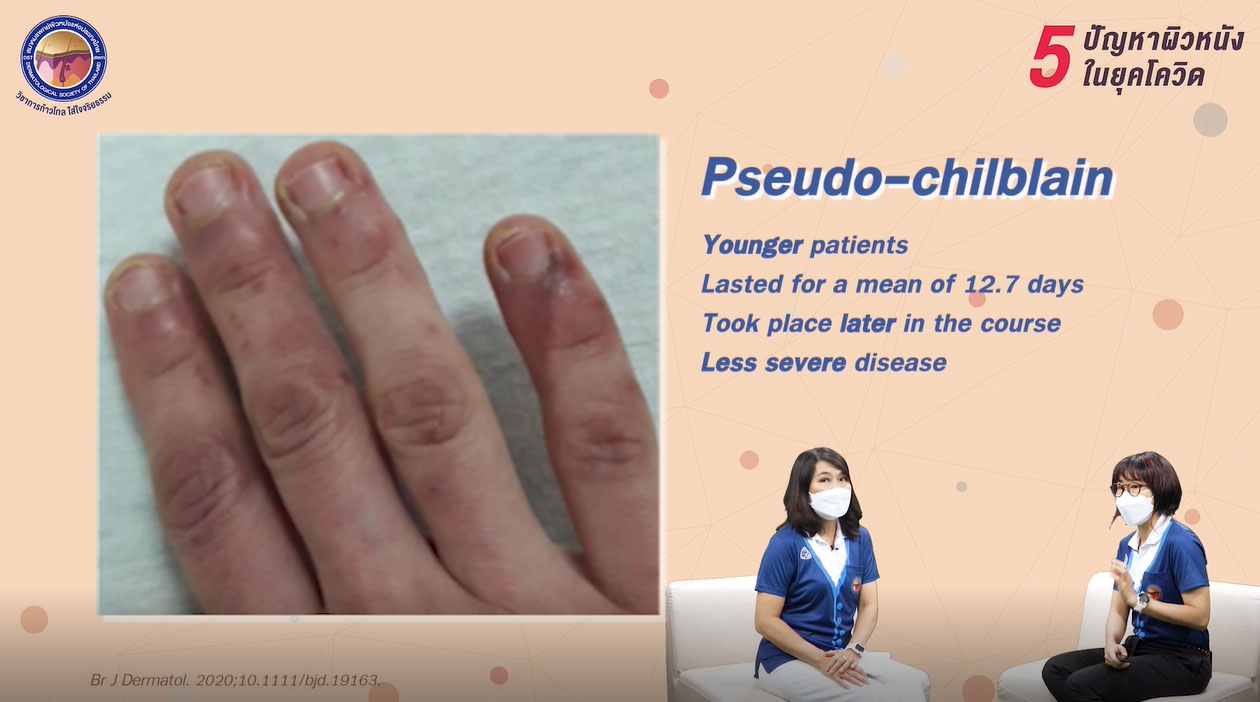 รศ.พญ.ภาวิณี ฤกษ์นิมิตร อนุกรรมการประชาสัมพันธ์และงานกิจกรรมงคมสมาคมแพทย์ผิวหนังแห่งประเทศไทยกล่าวว่า จากผลงานวิจัย Skin manifestations in COVID-19: The tropics experience เมื่อปีพ.. 2563 พบว่าสถิติผู้ป่วยโรคโควิด-19 ที่เข้ารับการรักษาที่โรงพยาบาลจุฬาลงกรณ์ จำนวน153 ราย มีอาการโรคผิวหนังร่วมด้วย 23 ราย หรือคิดเป็นสัดส่วน 15% โดยอาการบ่งชี้ทางผิวหนังของผู้ป่วยที่เกิดจากเชื้อไวรัสโคโรนา 2019 จะแบ่งออกเป็นหลายกลุ่มอาการ เช่นเป็นผื่นผิวหนังแบบผื่นลมพิษ ผื่นแดงชนิด maculopapular  เป็นตุ่มน้ำที่ผิวหนัง หรือผิวหนังแตกเป็นแผลจากการขาดเลือด  ผู้ป่วยโรคโควิด-19 ที่มีอาการทางผิวหนังในประเทศแถบยุโรป และประเทศเอเชียจะมีอาการทางผิวหนังแตกต่างกันอยู่บ้าง กล่าวคือ ผู้ป่วยโรคโควิด-19 ในประเทศแถบเอเชียมักมีอาการผื่นลมพิษ ผื่นแดงทั่วตัว หรือผื่นแบบตุ่มน้ำ ซึ่งพบในกลุ่มผู้ป่วยในประเทศแถบยุโรปเช่นกัน แต่ผู้ป่วยโรคโควิด-19 ในประเทศแถบยุโรปจะมีอาการหนึ่งที่ไม่พบผู้ป่วยในประเทศไทย คือมีอาการปลายมือปลายเท้าม่วงคล้ำ (ในทางการแพทย์ รู้จักกันในนาม Covid Toe) อันเนื่องมาจากสภาพภูมิอากาศที่หนาวเย็น ทั้งนี้วิธีการรักษาผู้ป่วยโรคโควิด-19 ที่มีอาการทางผิวหนัง แพทย์จะรักษาตามอาการ เช่น การให้ยาเสตียรอยด์รักษาอาการตุ่มนูน ตุ่มคัน หรือยาแก้แพ้รักษาอาการลมพิษ เป็นต้น