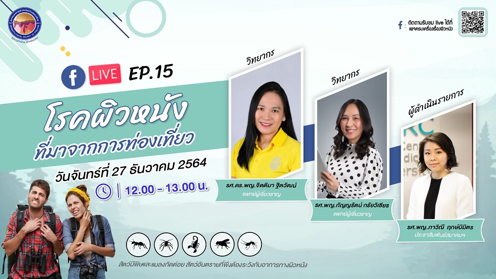 สมาคมแพทย์ผิวหนังแห่งประเทศไทยหรือ DST ตระหนักที่จะทำหน้าที่เพื่อตอบแทนสังคมและเผยแพร่และทำการรักษาและให้ความรู้กับประชาชนทั่วประเทศ ขอเชิญประชาชนและผู้สนใจทั่วไป เข้าชม Facebook Live ผ่านเพจเฟซบุ๊ก “ครบเครื่องเรื่องผิวหนัง” ใน EP.15 ตอน “โรคผิวหนังที่มาจากการท่องเที่ยว” ในวันจันทร์ที่ 27 ธันวาคม 2564 เวลา 12.00-13.00 น. โดย รศ.พญ.ภาวิณี ฤกษ์นิมิตร ประชาสัมพันธ์สมาคมแพทย์ผิวหนังแห่งประเทศไทย เป็นผู้ดำเนินรายการ และได้รับเกียรติจากวิทยากรที่มีชื่อเสียง 2 ท่าน ได้แก่ รศ.ดร.พญ.จิตติมา ฐิตวัฒน์ แพทย์ผู้เชี่ยวชาญสมาคมแพทย์ผิวหนังแห่งประเทศไทย และรศ.พญ.กัญญรัตน์ กรัยวิเชียร แพทย์ผู้เชี่ยวชาญสมาคมแพทย์ผิวหนังแห่งประเทศไทย