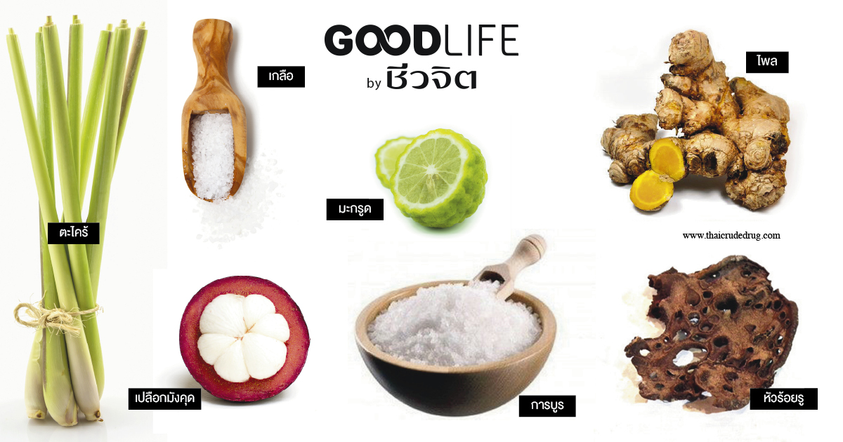 สมุนไพรสดหรือสมุนไพรแห้งที่ต้องเตรียม คือ ตะไคร้ มะกรูด ไพล เปลือกมังคุด หัวร้อยรู อย่างละ 15 กรัม เกลือและการบูร อย่างละ 1-2 ช้อนชา นำสมุนไพรทั้งหมดมาต้มเดือด 15 นาที แล้วเติมเกลือและการบูร ตามทีหลัง  ยกลงจากเตา
