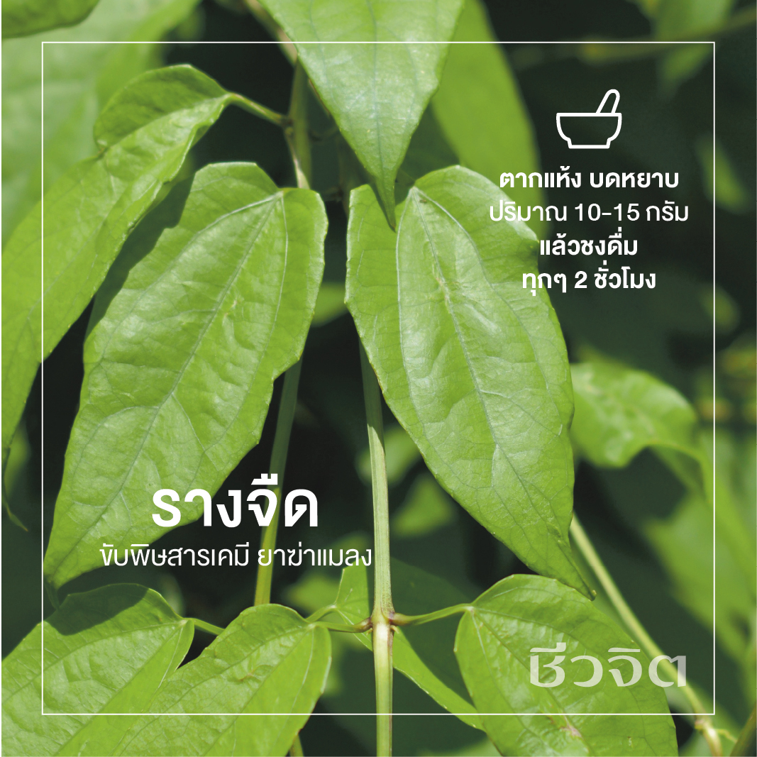 วิธีกิน : นำใบรางจืดมาตากแห้ง บดหยาบๆ ปริมาณ 10-15 กรัม แล้วชงในน้ำเดือด ดื่มทุกๆ 2 ชั่วโมง