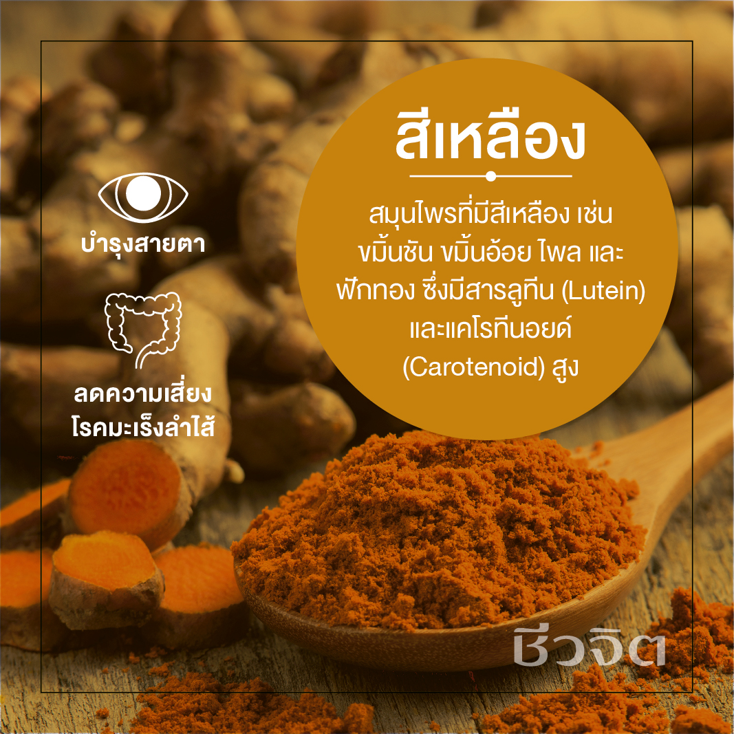 สมุนไพรที่มีสีเหลือง เช่น ขมิ้นชัน ขมิ้นอ้อย ไพล และฟักทอง ซึ่งมีสารลูทีน (Lutein) และแคโรทีนอยด์ (Carotenoids) สูง