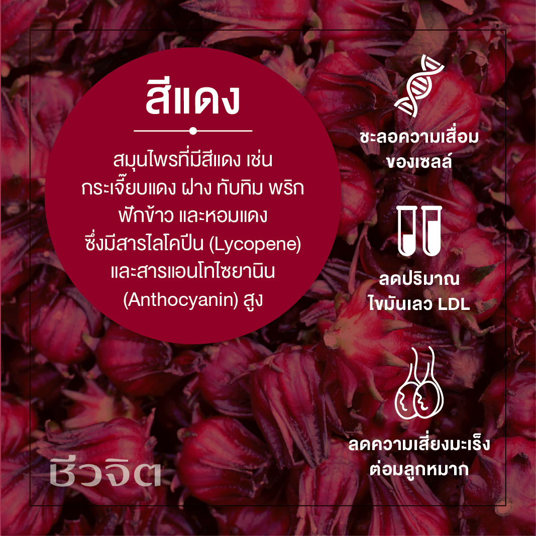 สมุนไพรที่มีสีแดง เช่น กระเจี๊ยบแดง ฝาง ทับทิม พริก ฟักข้าว และหอมแดง ซึ่งมีสารไคโคปีน (Lycopene) และสารแอนโทไซยานิน (Anthocyanin) สูง