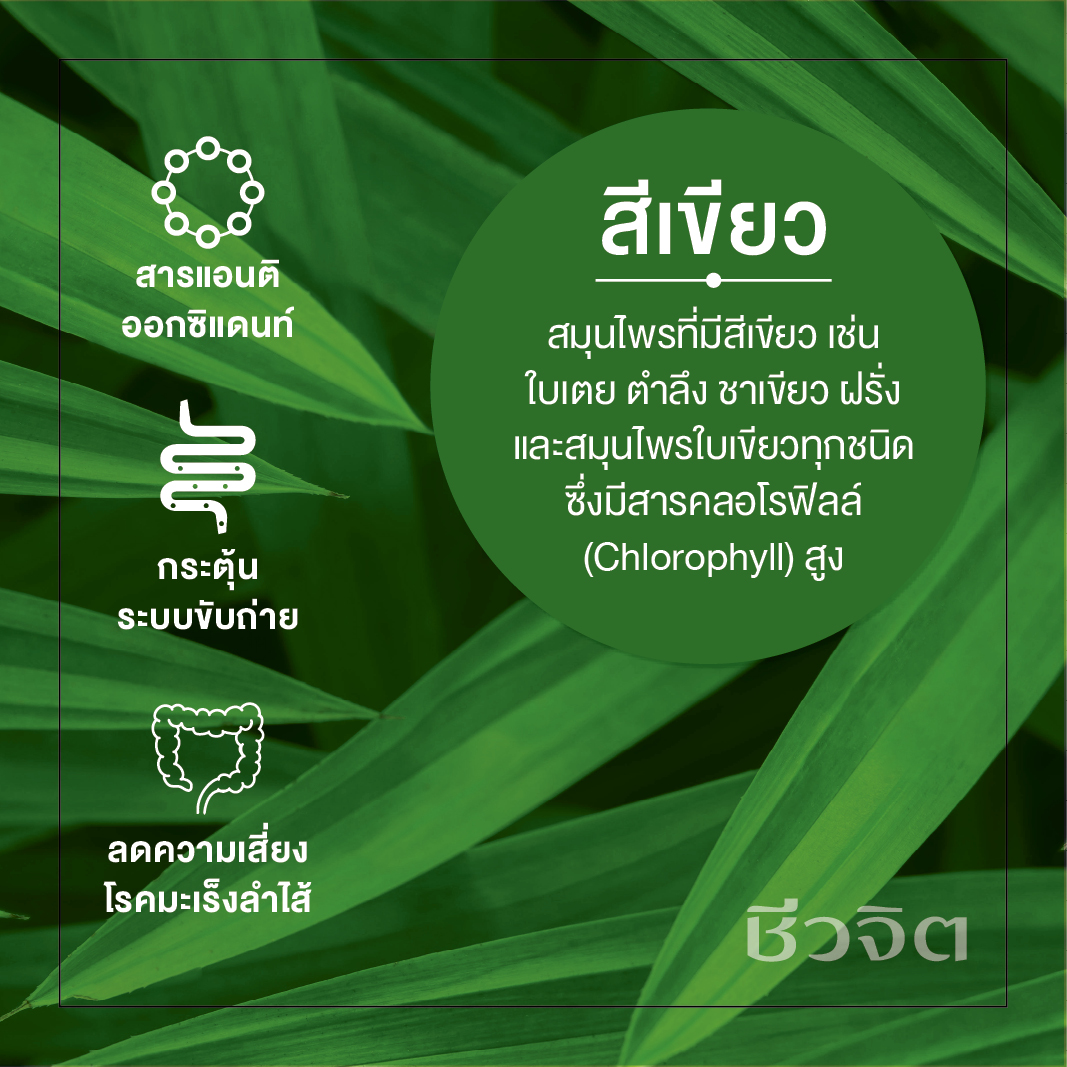 สมุนไพรที่มีสีเขียว เช่น ใบเตย ตำลึง ชาเขียว และฝรั่ง หรือสมุนไพรใบเขียวทุกชนิด ซึ่งมีสารคลอโรฟิลล์(Chlorophyll)