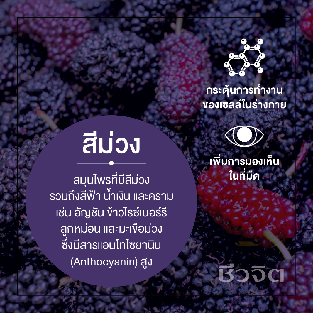สมุนไพรที่มีสีม่วง เช่น อัญชัน ข้าวไรซ์เบอร์รี ลูกหม่อน และมะเขือม่วง ซึ่งมีสารแอนโทไซยานิน (Anthocyanin) ทั้งสีฟ้า น้ำเงิน และครามสูง