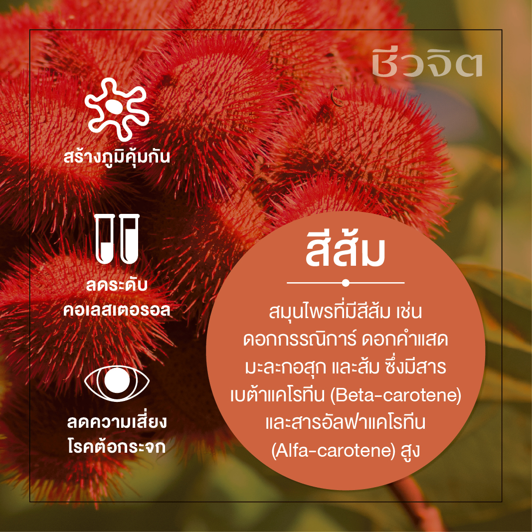 สมุนไพรที่มีสีส้ม เช่น ดอกกรรณิกา ดอกคำแสด มะละกอสุก ส้ม ซึ่งมีสารเบต้าแคโรทีน(Beta carotene) และสารอัลฟาแคโรทีน (Alfa carotene)สูง