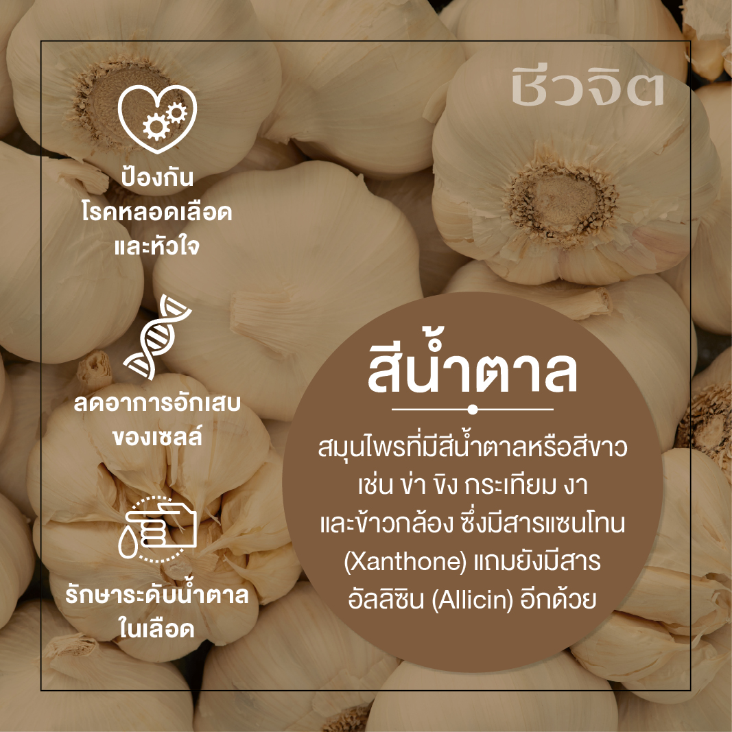 สมุนไพรที่มีสีน้ำตาลหรือสีขาว เช่น ข่า ขิง กระเทียม งา และข้าวกล้อง ซึ่งมีสารแซนโทน (Xanthone) แถมยังมี