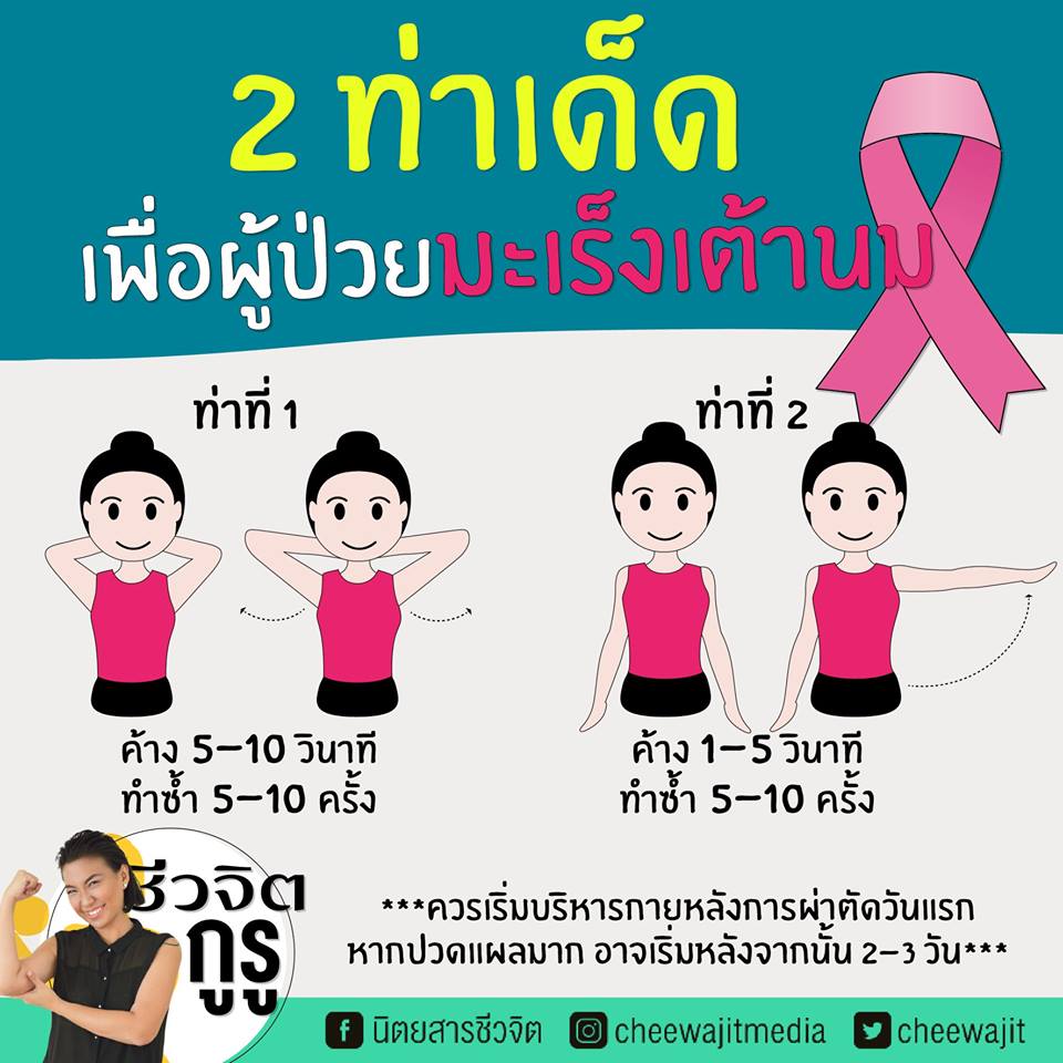 หลังผ่าตัดมะเร็งเต้านม โดยเฉพาะผู้ที่ผ่าตัดเลาะต่อมน้ำเหลืองที่รักแร้ออก อาจส่งผลให้การเคลื่อนไหวของแขนและไหล่ติดขัดได้ ดังนั้น ผู้ป่วยจึงควรบริหารร่างกายเพื่อลดอาการผิดปกติ