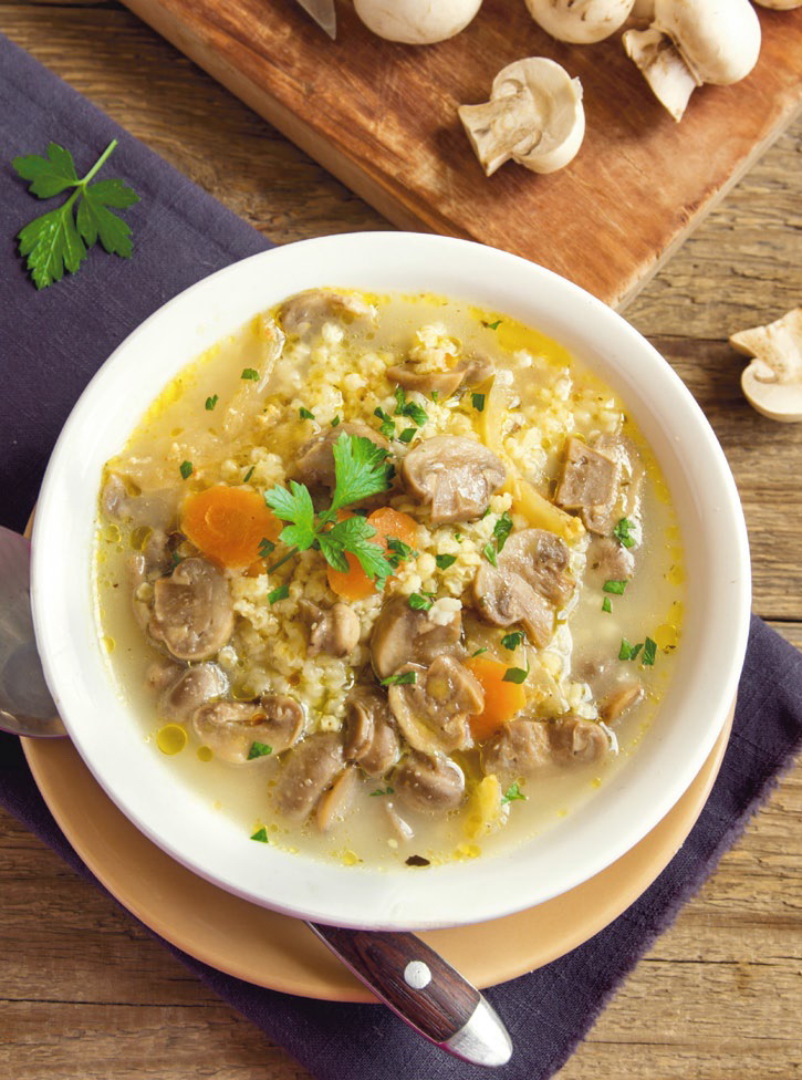3. เตรียมข้าวกล้องหรือข้าวผสมธัญพืชร้อนๆ ไว้ในชาม ตักน้ำซุป ข้าวต้มเห็ดราดลงไป โรยหน้าด้วยขิงอ่อนซอย กระเทียมเจียว ต้นหอม ผักชี และขึ้นฉ่าย