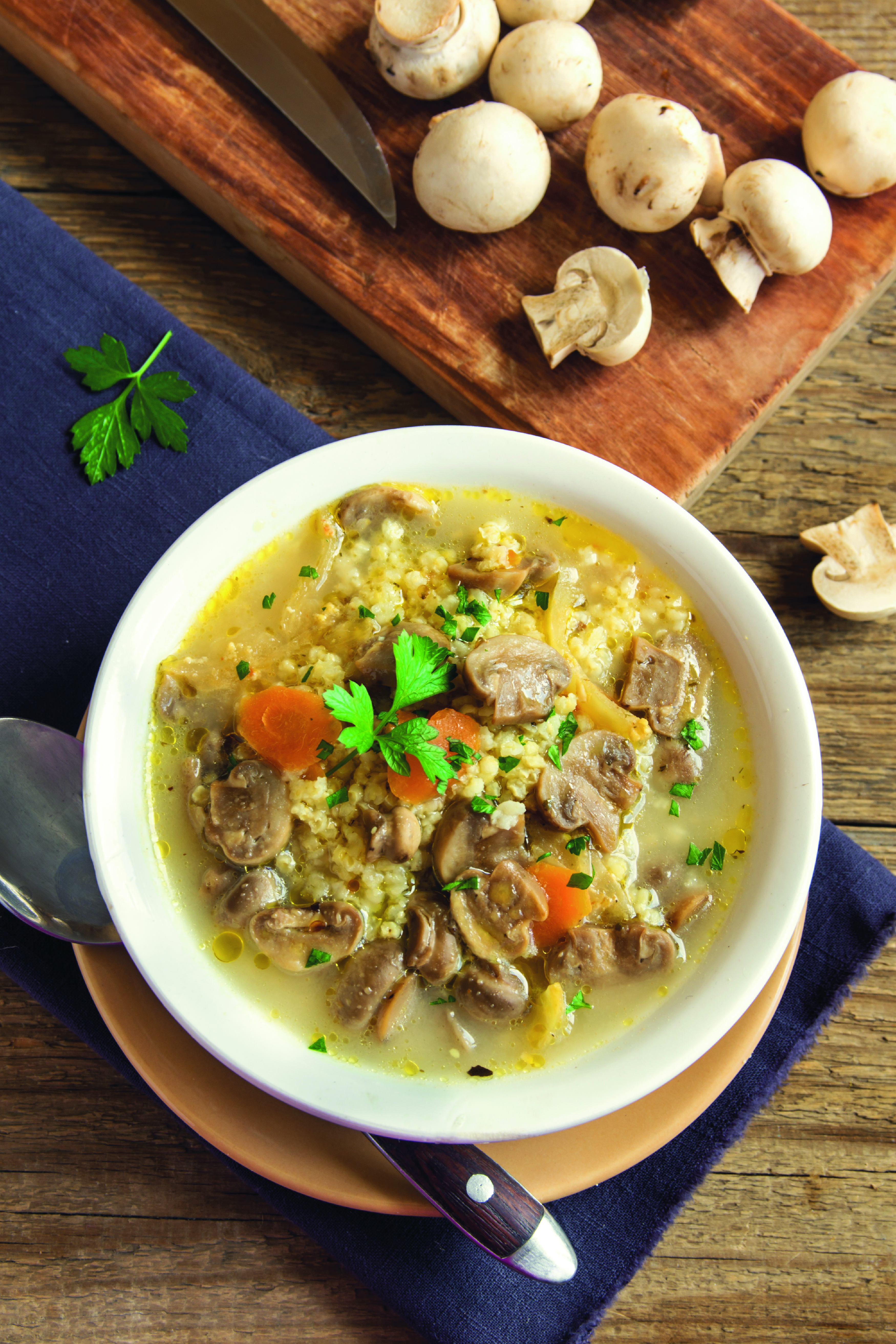 3. เตรียมข้าวกล้องหรือข้าวผสมธัญพืชร้อนๆไว้ในชาม ตักน้ำซุป ข้าวต้มเห็ดราดลงไป โรยหน้าด้วยขิงอ่อนซอย กระเทียมเจียว ต้นหอม ผักชี และขึ้นฉ่าย