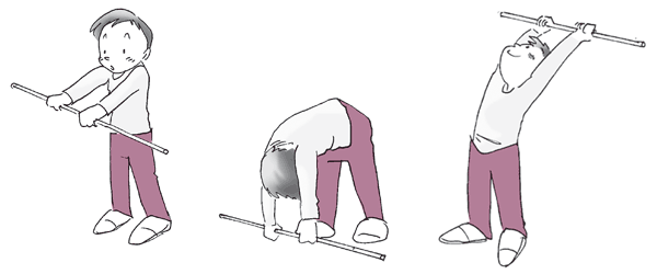4. ตามองกระบองอย่างมีสมาธิ แล้ววาดแขนลงพร้อมๆกับก้มตัวลงให้มากที่สุด ไม่งอเข่า และแขนเหยียดตรงตลอดเวลา