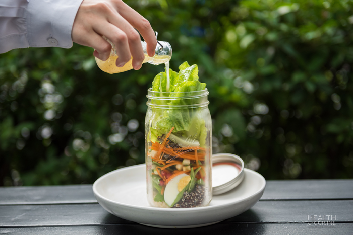 เมนูสลัดแซลมอน ราดซอสงาสไตล์ญี่ปุ่น เป็นอีกหนึ่งเมนูสำหรับคนรักสุขภาพที่สามารถซื้อกลับบ้านได้แถมยังมีส่วนลด 50% ในช่วงเย็นอีกด้วย