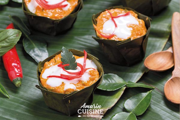 - ผสมเนื้อปลากรายกับน้ำพริกแกงเผ็ดเข้าด้วยกัน ค่อยๆเติมหัวกะทิลงไปทีละน้อย นวดให้ส่วนผสมเข้ากันดี ใส่ปลาหมึก เนื้อปู และกุ้ง เคล้าให้เข้ากัน