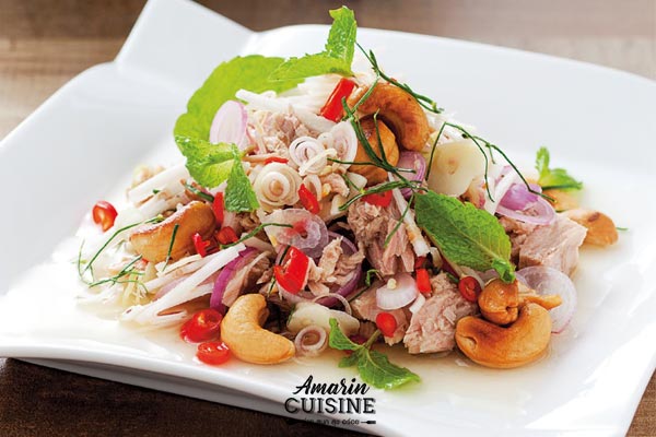 3. ใส่ปลาทูน่าลงไปเคล้าเบาๆ ตามด้วยเม็ดมะม่วงหิมพานต์ ตักใส่จาน โรยใบสะระแหน่ เสิร์ฟพร้อมผักสด