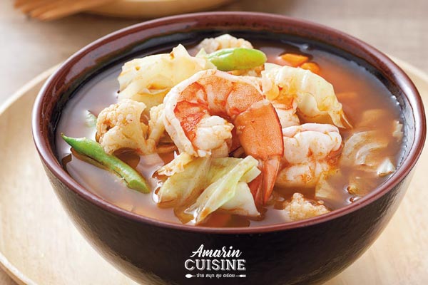 - ใส่หัวไช้เท้าลงต้มจนสุก จากนั้นใส่กุ้งสด ตามด้วยกะหล่ำปลี ถั่วฝักยาว และผักกาดขาว ต้มจนผักสุก