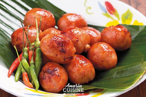 - กรอกส่วนผสมที่เตรียมไว้ลงในไส้หมู (อย่าให้แน่นจนเกินไป) แล้วมัดด้วยเชือกเป็นท่อนๆความยาวตามต้องการ นำไปผึ่งแดดไว้ประมาณ 1 วัน