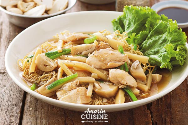 5. จัดเส้นใส่ชามที่รองด้วยผักกาดหอม ราดน้ำโกยซีหมี่ โรยพริกไทยป่น เสิร์ฟพร้อมจิ๊กโฉ่ว