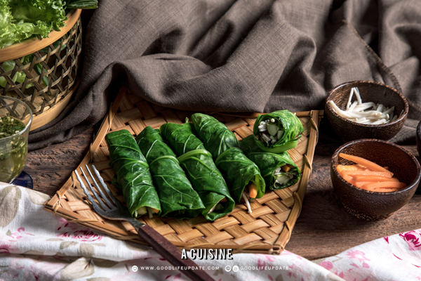 วางผักกาดหอม ใบโหระพา แตงกวา แครอท เห็ดหอม เห็ดเข็มทอง ลงบนใบคะน้า ม้วนเป็นโรลจนสุดใบคะน้า