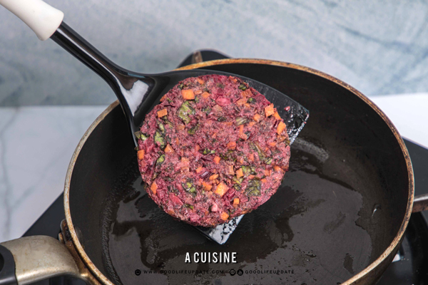 - ผสมบีทรูท ผักกาด แครอท กระเทียม หอมแดง พริกไทย เกลือ ให้เข้ากัน ค่อยๆใส่แป้งสาลี จนส่วนผสมทั้งหมดเริ่มจับตัวกัน จนพอใจ ตักใส่พิมพ์ ให้สวยงาม