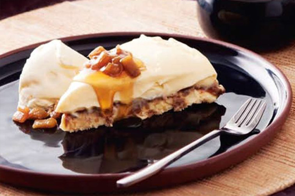 5. ตัดชีสเค้กเป็นชิ้นตามชอบ ตักวิปปิ้งครีมเคียงด้านข้าง โรยหน้าชีสเค้กด้วยน้ำผึ้งหรืออบเชยป่นตามชอบ แต่งหน้าด้วยสายบัวท็อปปิ้ง