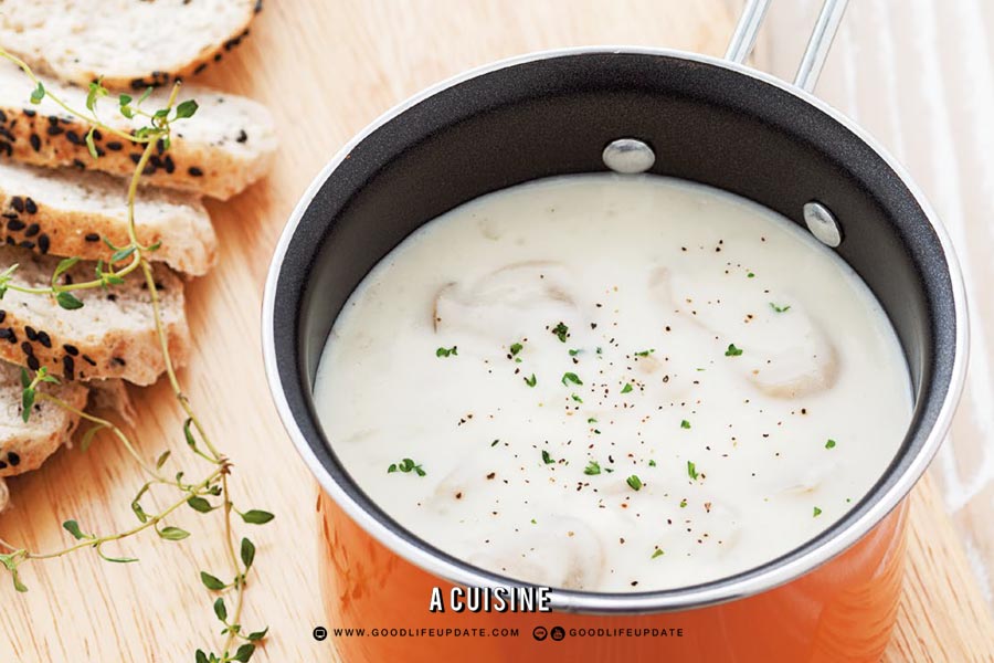 - ใส่เห็ดฟางที่พักไว้ในข้อแรกลงไป คนให้เข้ากัน ปรุงรสด้วยเกลือและพริกไทย เติมครีมเทียมชนิดน้ำ ตักเสิร์ฟได้ทันที