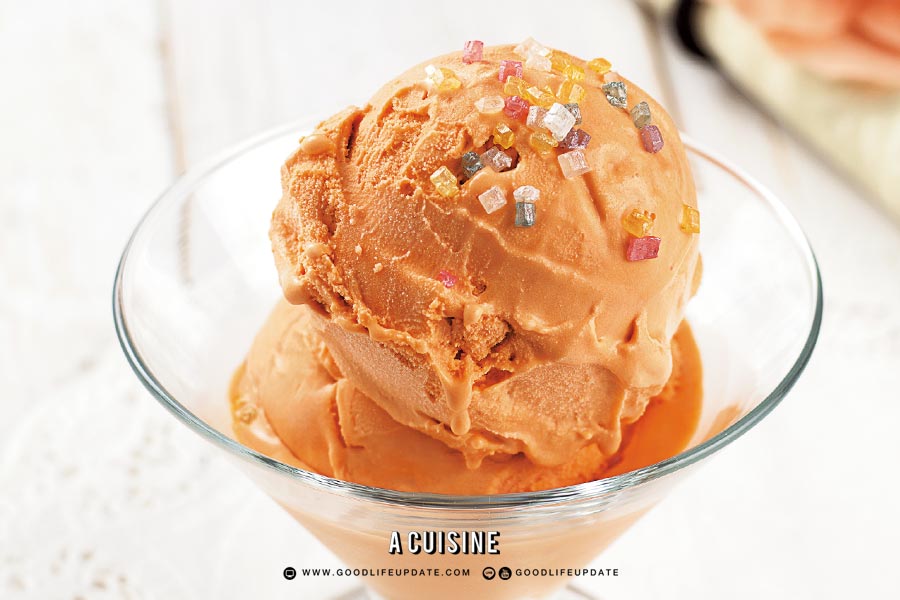 - นำไปแช่เย็นไว้ 4 – 8 ชั่วโมงจนส่วนผสมเย็นจัด แล้วนำไปปั่นด้วยเครื่องปั่นไอศกรีม ตักใส่ภาชนะมีฝาปิดมิดชิด นำไปแช่ช่องแข็งประมาณ 6 ชั่วโมงหรือจนแข็งดี
