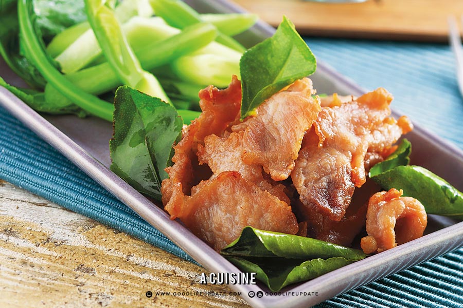 4. ตักหมูทอดน้ำปลาใส่จาน เคียงด้วยใบมะกรูดทอดและคะน้าลวก