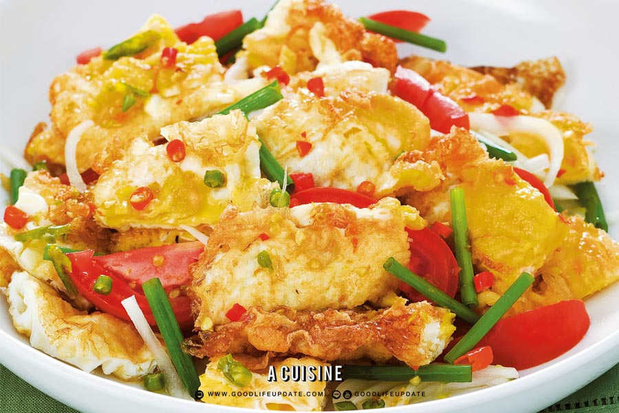 - ใส่ไข่ดาวกรอบ แครอต ขึ้นฉ่าย และต้นหอมเคล้าเบา ๆ พอเข้ากัน ตักใส่จานเสิร์ฟได้ทันที